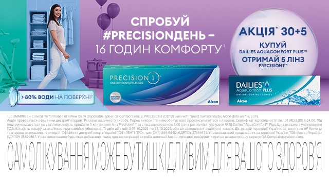 З 01.10.2025 по 31.10.2025 (або до вичерпання акційного товару) проходитиме Всеукраїнська акція МКЛ Alcon Dailies AquaComfort Plus 30 лінз + Precision 1 5 лінзи. При купівлі 1 упаковки (30 шт) Dailies AquaComfort Plus надається у подарунок 5 лінз Precision 1 такої ж діоптрії.